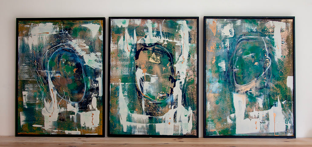 This striking triptych comprises three abstract acrylic canvases, each measuring 64 x 84cm, that unite to form a cohesive 196 cm installation when displayed with a 2cm gap between panels. Rendered in sophisticated emerald, gold, and sapphire tones with crisp off-white accents, the composition explores the essence of human form through gestural abstraction. The layered colour palette creates visual depth and movement across the series, whilst the monumental scale commands presence in any interior space. Ideal for collectors seeking contemporary artwork that balances artistic sophistication with bold decorative impact.