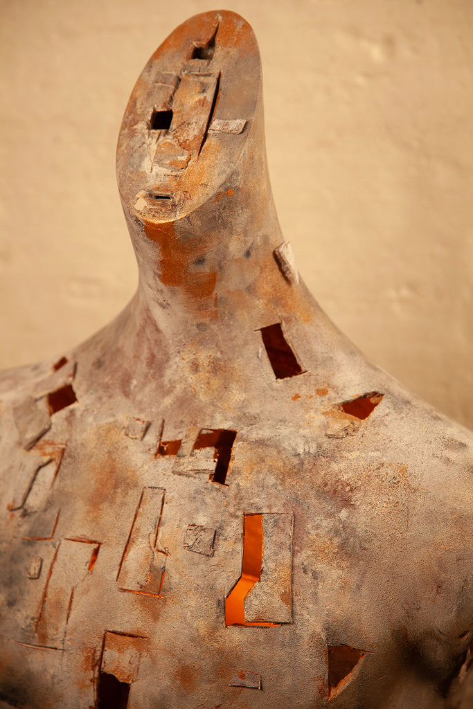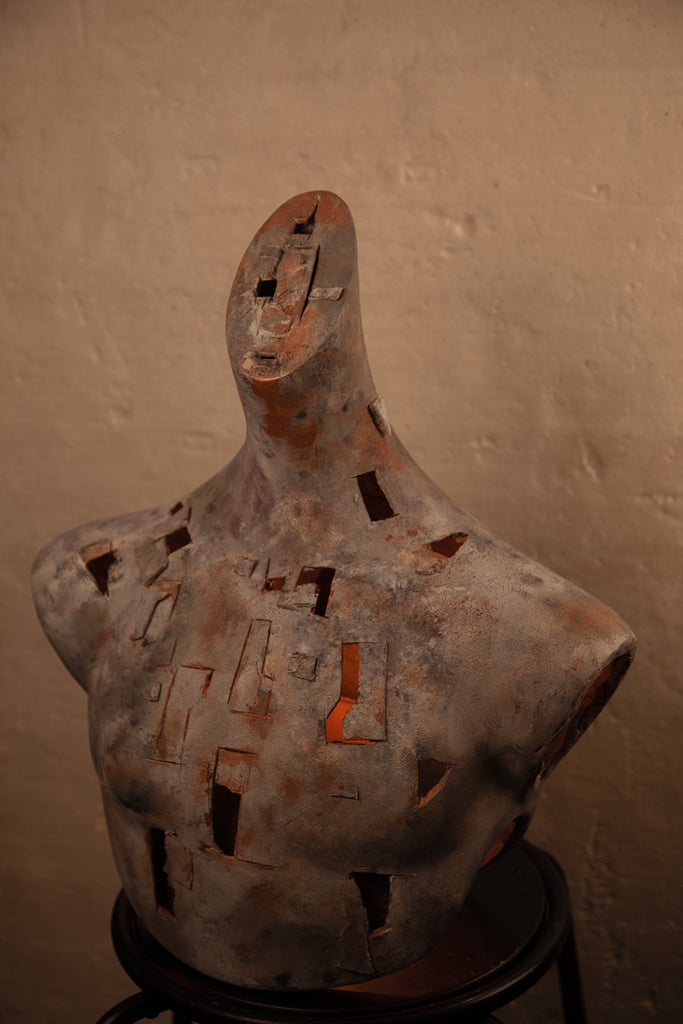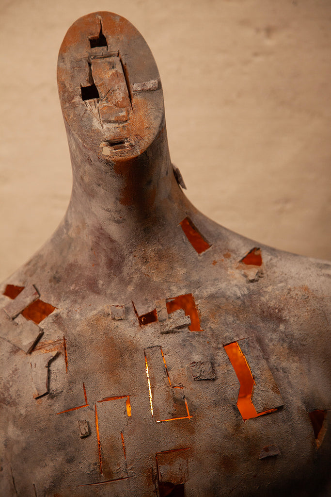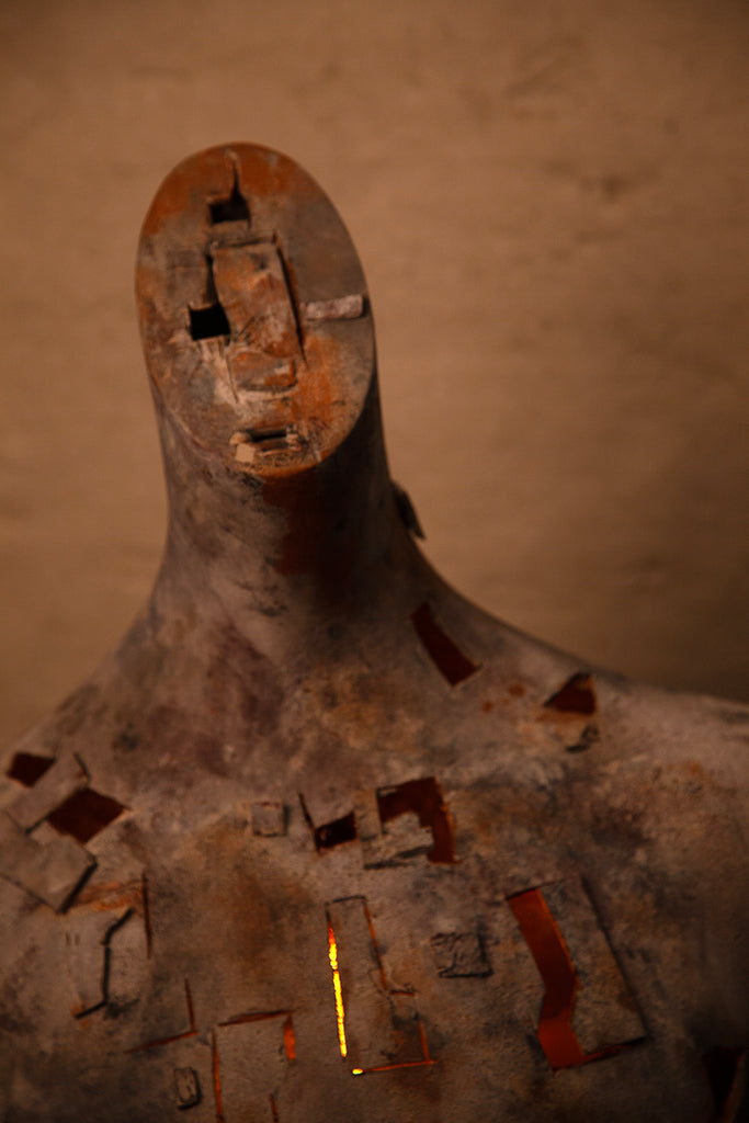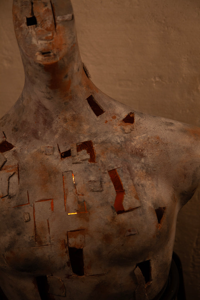 Reclaimed Mannequin Torso lit from Inside cutouts in the body and sidelight spills Inspired y Brutalist Buildings . LED Lamps only